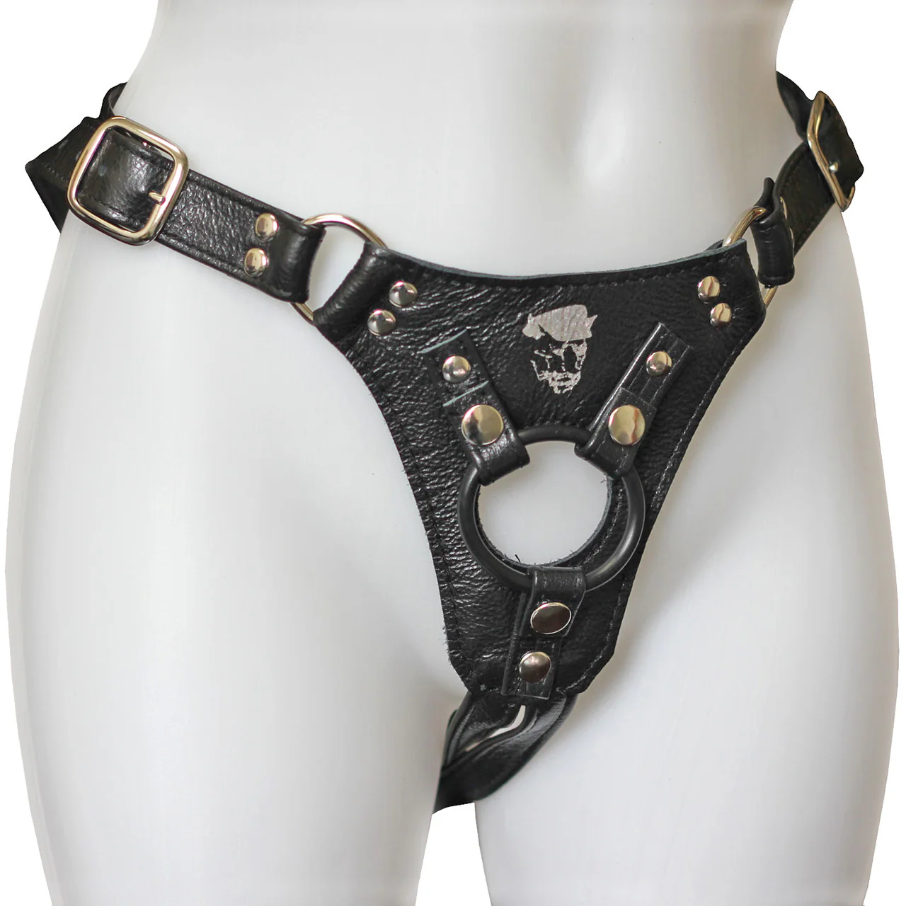 Designed for the ultimate ride, the Jaguar's dildo placement is lower than most traditional harnesses allowing for delicious pressure on the clit. Two strap design allows for plenty of access. A three point snap out O ring system (comes with one-2" rubber o-ring) allows for interchangeable O ring sizes. The Jaguar's soft, heavy garment leather and sleek design allow it it to perform equally well as a packing harness that can handle a hard fucking cock.