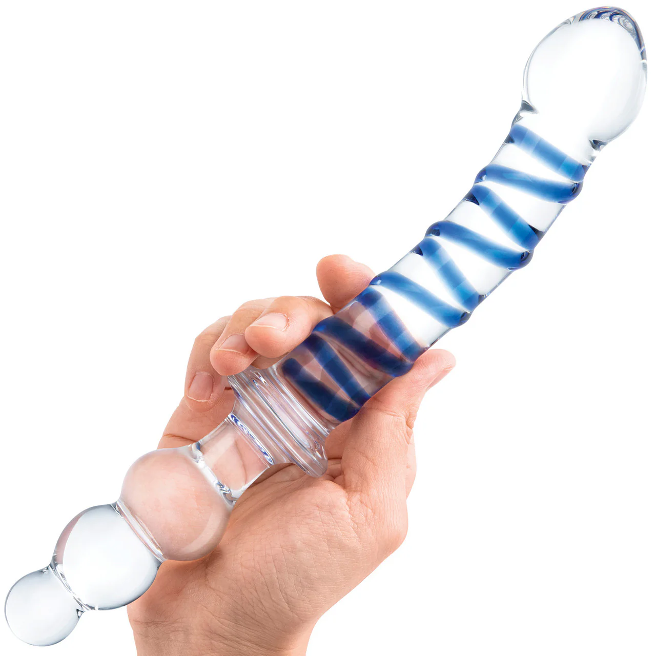 The Gläs 10" Twister Dual-Ended Dildo is perfect for beginners and experienced users alike. One end features a rim that twists along half of the shaft, while the other end features different sized beads for insertion. A tapered realistic tip makes it easy to insert and play with, while a flat center base prevents unwanted travel.